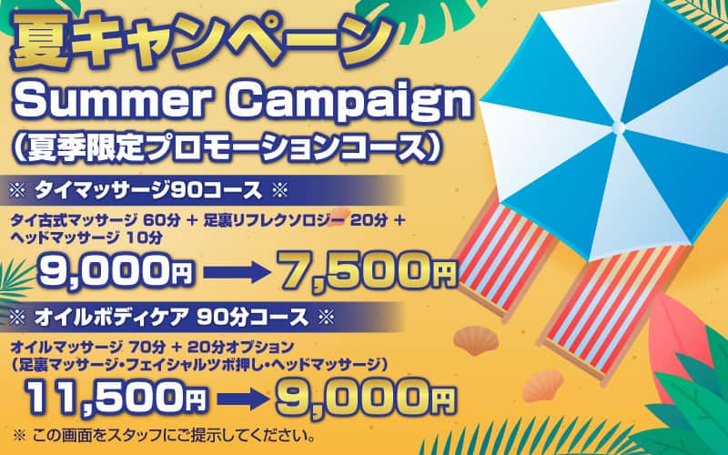 夏キャンペーン ナコーンタイ タイ古式マッサージ | 大阪 鶴橋 大阪上本町 谷町九丁目